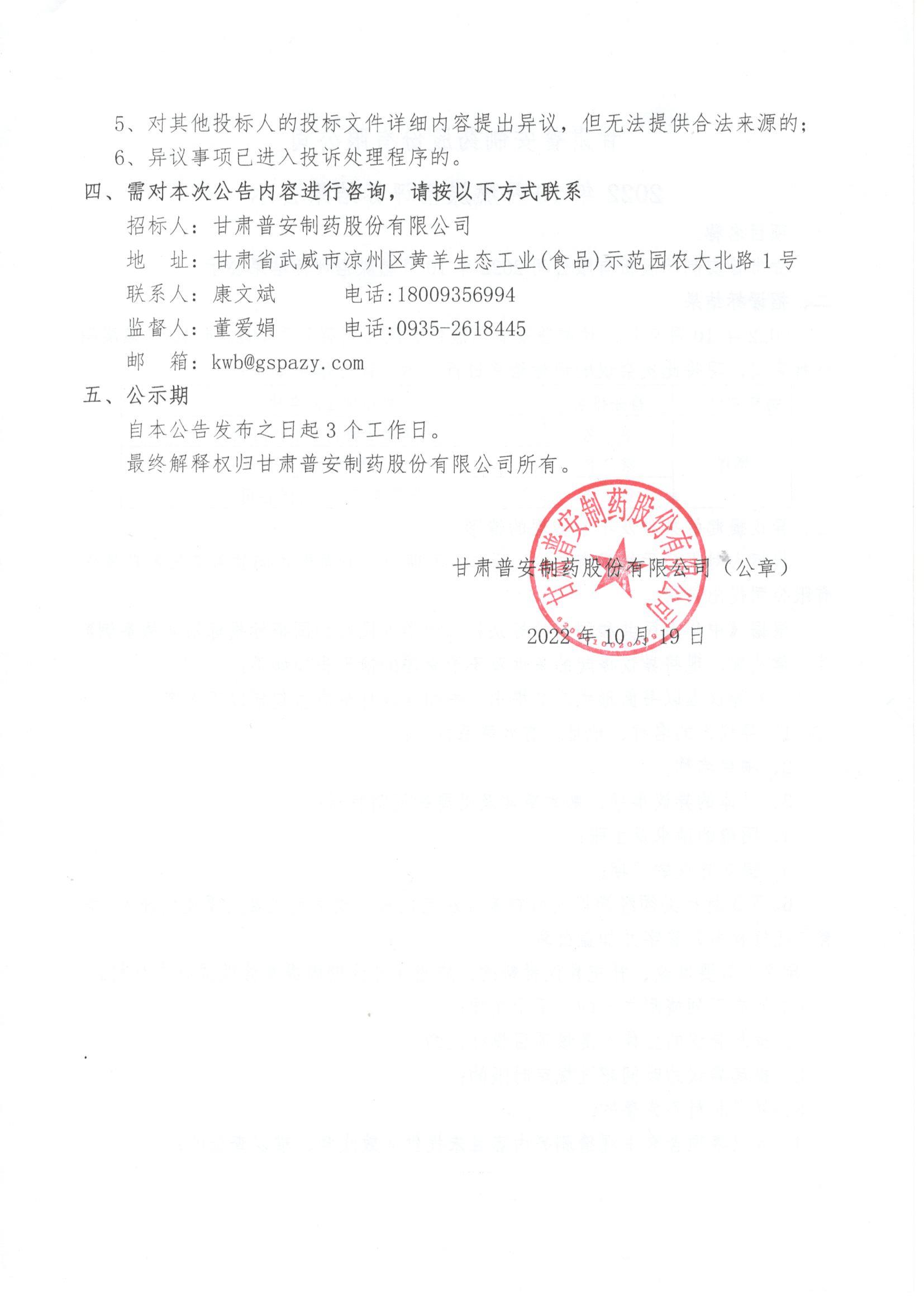 甘肅普安制藥股份有限公司2022年10月燃煤招評標結果的公示