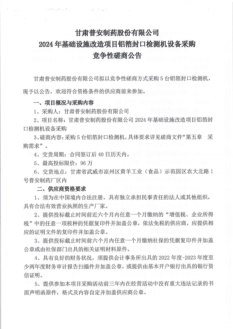 甘肅普安制藥股份有限公司2024年基礎設施改造項目鋁箔封口檢測機設備采購競爭性磋商公告