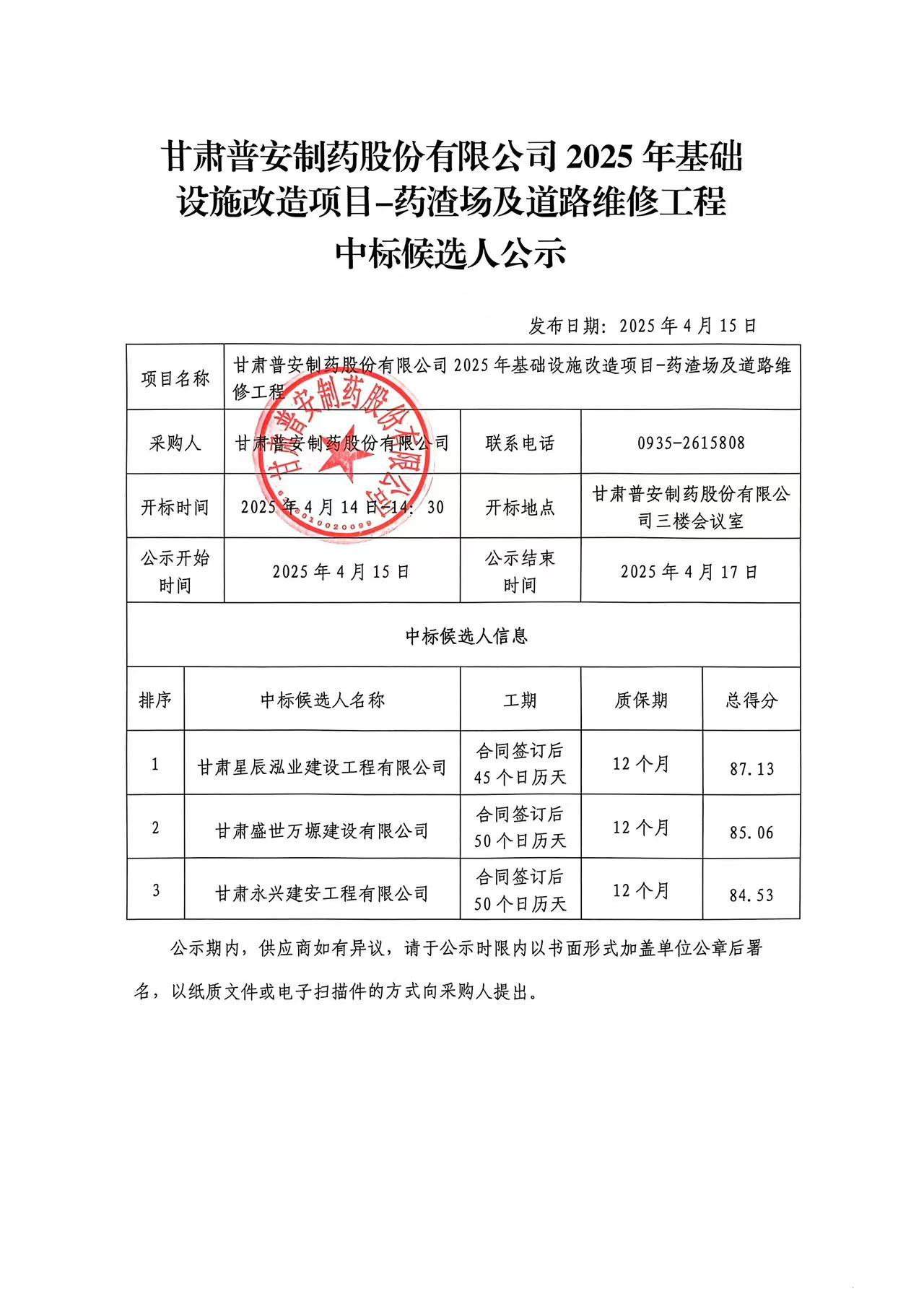 甘肅普安制藥股份有限公司2025年基礎(chǔ)設(shè)施改造項目-藥渣場及道路維修工程中標(biāo)候選人公示